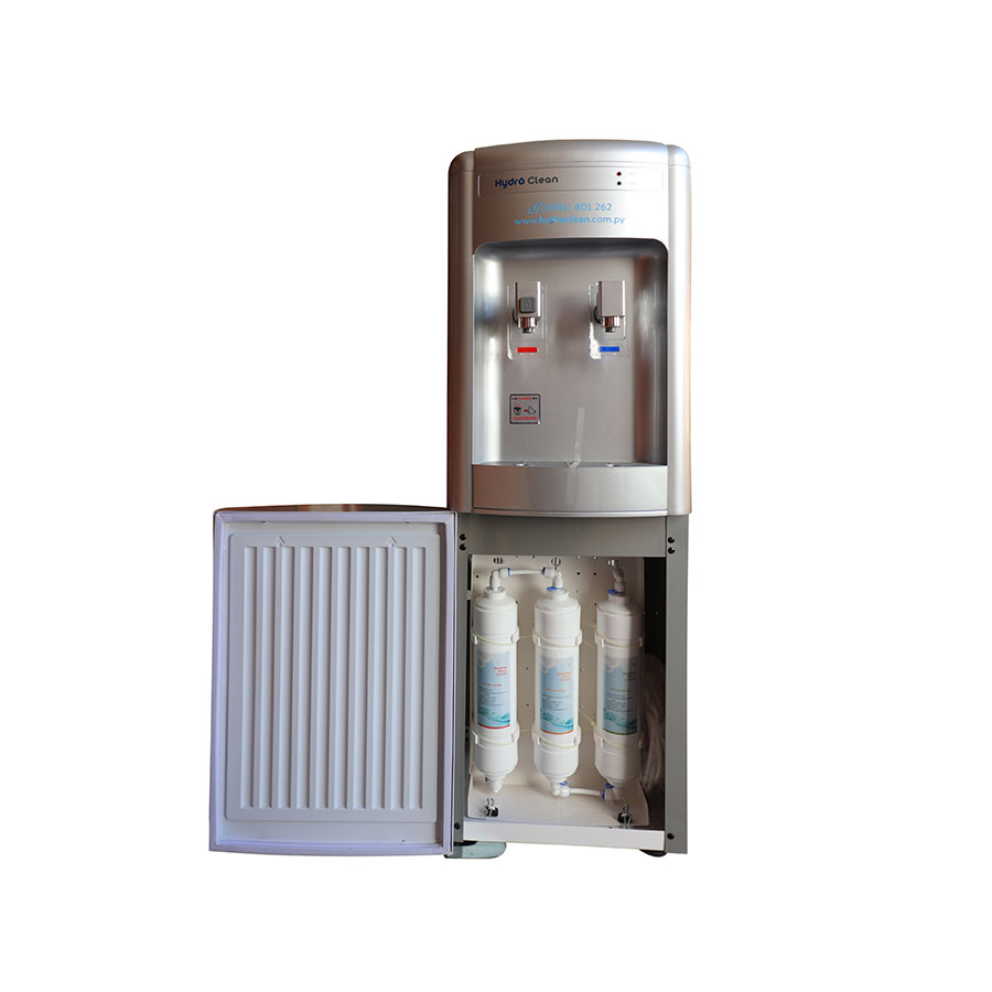 El Bebedero Hydro Clean de pie cuenta con agua fría y agua caliente a la temperatura ideal. Cuenta con tres filtros internos, el prefiltro de polipropileno y los filtros de carbón granulado y carbón en bloque.